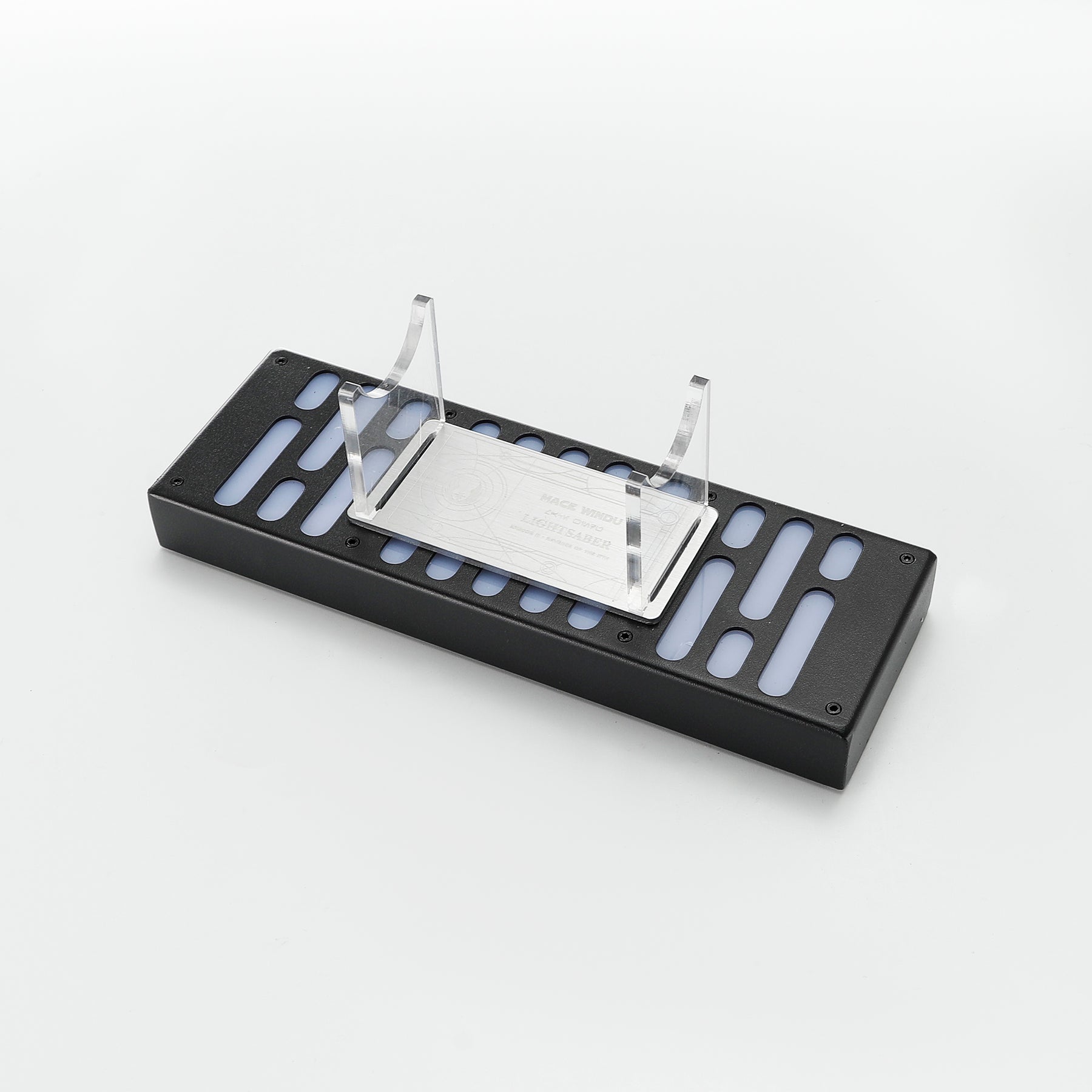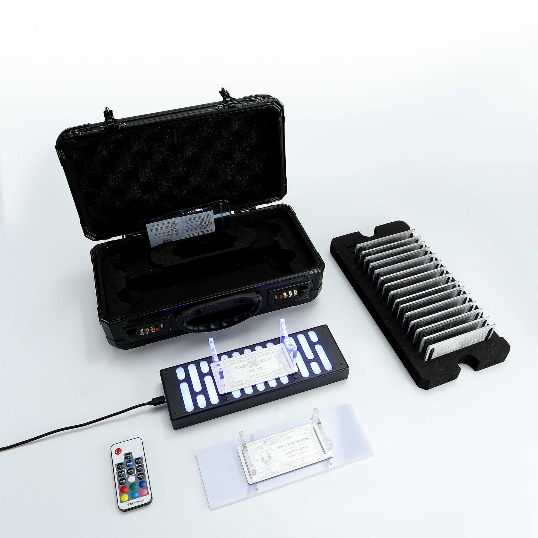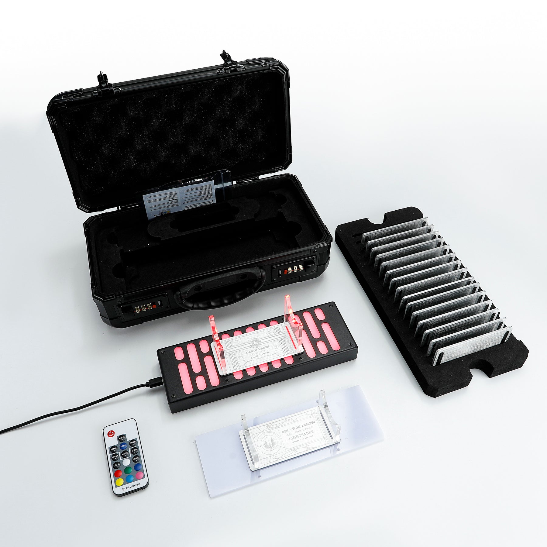 This is a new lightsaber accessory, including a lightsaber stand, a hand remote-controlled RGB LED display stand and 17 lightsaber name cards.Case Material: Aluminum alloy, Color: Black, Dimensions: 325*165*125mm