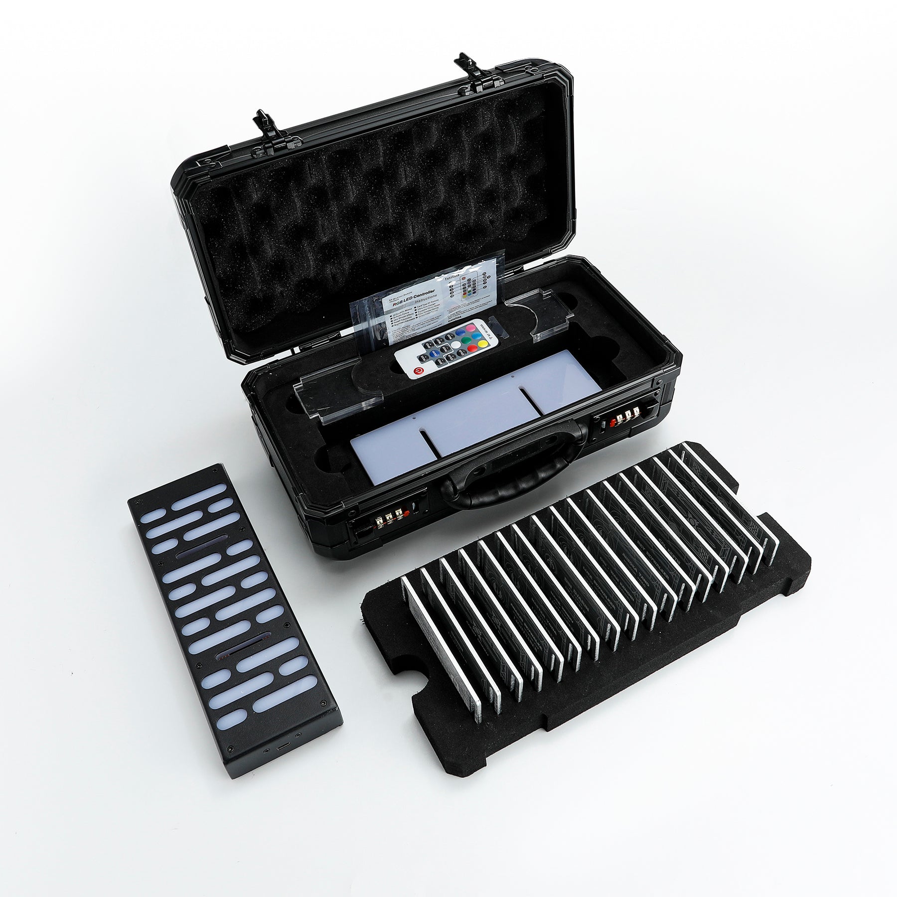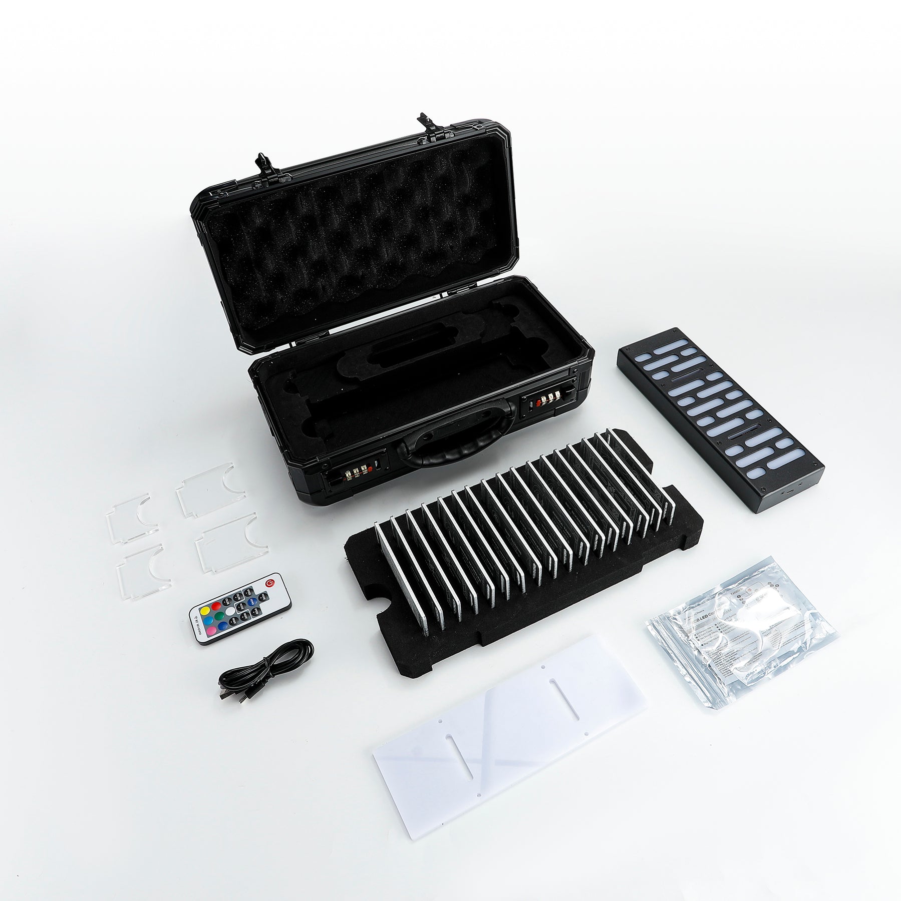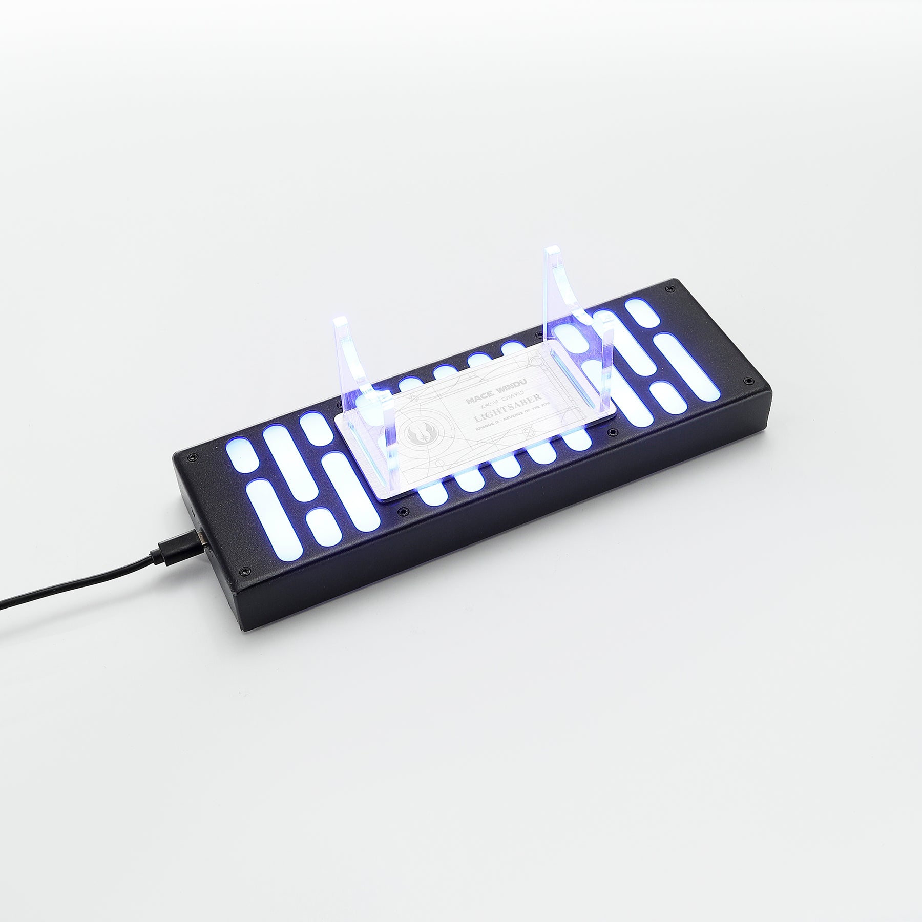 This is a new lightsaber accessory, including a lightsaber stand, a hand remote-controlled RGB LED display stand and 17 lightsaber name cards.Case Material: Aluminum alloy, Color: Black, Dimensions: 325*165*125mm